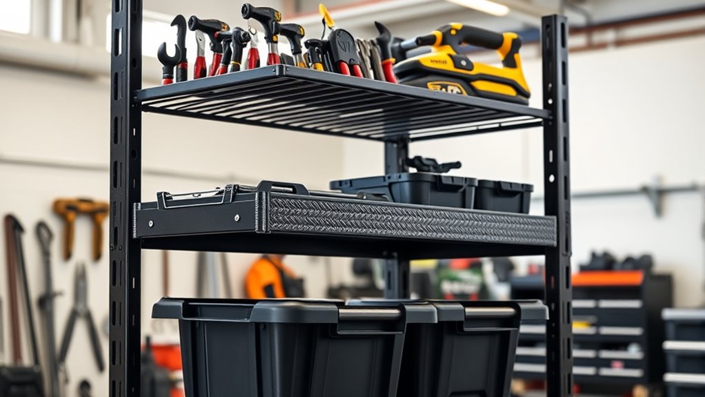 Implementing a dual-layer rack considerably boosts durability, ensuring it withstands heavy use and harsh environments over time. Its sturdy construction resists warping, cracking, and corrosion, extending the rack’s lifespan. This investment pays off by maintaining its aesthetic appeal, keeping your setup looking professional and organized. The enhanced durability means fewer replacements and repairs, which improves cost efficiency over the long run. You’ll appreciate how the rugged design supports your equipment securely, even during intensive use. Plus, the sleek, dual-layer design adds a modern touch to your space, elevating its visual appeal. Developing a long-term investment mindset helps you recognize the value of durable equipment, ensuring your setup remains functional and attractive for years to come. Ultimately, a dual-layer rack offers a smart, long-term solution that protects your investment and keeps your environment looking sharp for years to come.