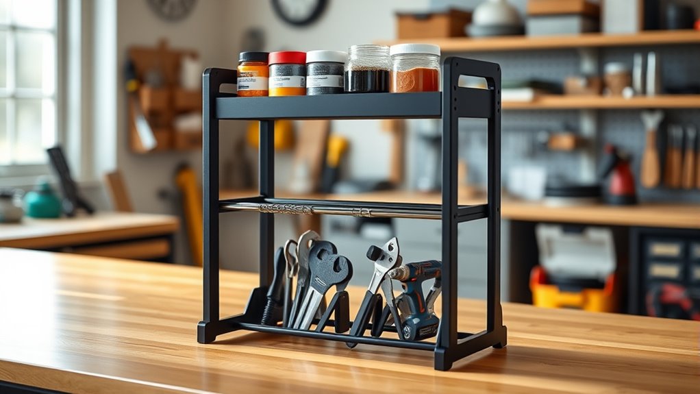 You’ll find that a dual-layer rack can fit in standard equipment spaces, but it depends on your setup. Its sleek rack aesthetics blend well without clutter, while the sturdy material durability guarantees long-lasting use. Measure your available space carefully to confirm compatibility. This versatile design maximizes storage without sacrificing style or strength, making it a smart addition that seamlessly integrates into your existing setup.
