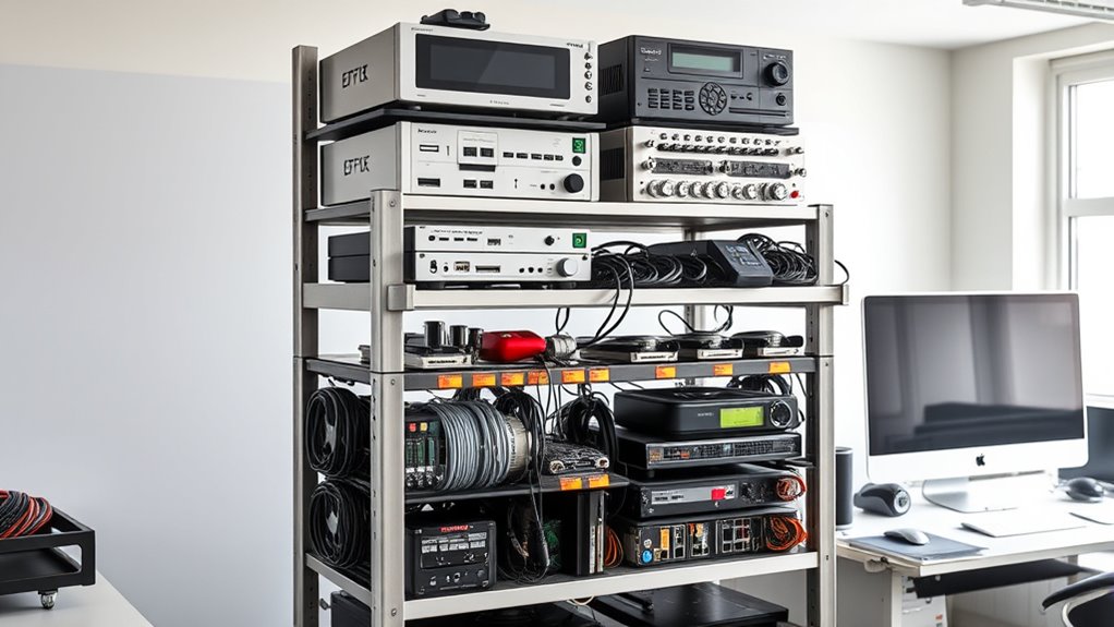 Effective ventilation and moisture barriers help reduce humidity-related risks, but protecting your sensitive equipment from physical damage requires additional measures. A well-organized cable management system prevents accidental pulls and tangles that can cause equipment to fall or break. Secure mounting and padded racks add an extra layer of protection against shocks and impacts. To maintain aesthetic appeal, choose racks with clean cable routing options and uniform layouts, which also improve airflow and ease maintenance. Cover panels or shields can guard against dust, debris, and accidental bumps. Additionally, understanding lifestyle factors like proper storage and handling can further prolong your gear’s lifespan. By combining sturdy construction with thoughtful cable management, you minimize the risk of damage and keep your gear safe. This extensive approach ensures your setup remains resilient, functional, and visually appealing.