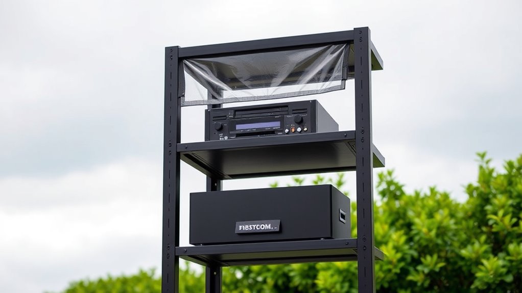 Humidity can pose a significant threat to sensitive equipment, causing corrosion, short circuits, and data loss if left unchecked. To minimize these risks, you should focus on effective ventilation strategies and moisture barriers. Proper ventilation helps circulate air and reduces humidity buildup, protecting your gear from excess moisture. Moisture barriers, like vapor-proof covers or sealants, prevent environmental moisture from penetrating your rack. Consider these tips: