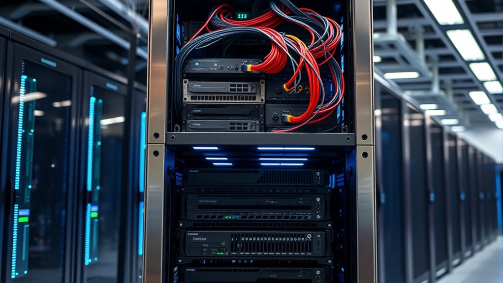 Supporting future expansion and upgrades is crucial to guarantee your data center remains flexible and cost-effective over time. A dual-layer rack simplifies this by providing extra space and easy access for adding new equipment. Proper cable management is essential here; neatly organized cables prevent clutter and minimize airflow disruptions, making upgrades smoother. The aesthetic appeal of a well-organized rack also improves overall visibility and maintenance efficiency. To maximize benefits, consider these points: