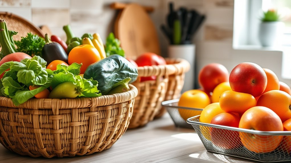 Reusable baskets and mesh trays can positively impact food preservation and storage efficiency by keeping produce well-ventilated and reducing moisture buildup. This helps maintain freshness and extends shelf life. However, if not cleaned properly, they may harbor bacteria that could spoil food faster. Regular sanitation ensures they support food preservation, keeping your items fresh longer and making your storage more efficient.