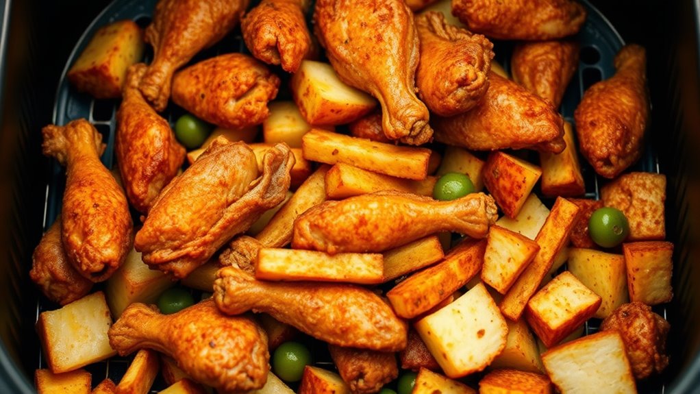 Coincidentally, you can cook multiple types of food together, but it depends on food flavor compatibility and cooking time adjustments. Keep in mind, some foods release moisture or strong flavors that might affect others, so choose items wisely. To guarantee even cooking, consider stirring or shifting foods midway. Adjust cooking times accordingly, and avoid overcrowding the basket, so everything cooks properly without mixing flavors undesirably.