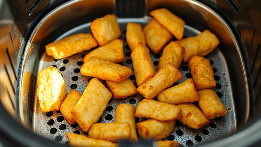 If you don’t shake or flip your food during air frying, you risk uneven cooking and a less desirable texture. Regularly tossing or flipping ensures proper seasoning distributes evenly and that food with different thicknesses cooks uniformly. Thicker pieces, like chicken breasts or potato wedges, need to be flipped halfway to avoid burning on one side and undercooking on the other. Skipping this step can result in dry, overcooked spots or soggy areas. Remember to check for food that’s uneven in size or density, and adjust your flipping schedule accordingly. Properly flipping or shaking your food not only promotes even cooking but also enhances flavor and texture. It’s a simple step that makes a big difference in your air frying results. Additionally, understanding the importance of even heat distribution can help you achieve consistently better outcomes with less guesswork.