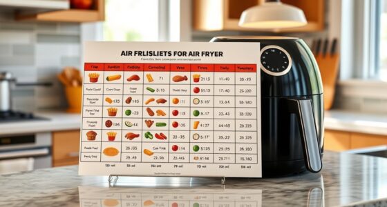 Relying solely on the recommended cooking time can lead to undercooked or overdone food, even if the timer runs out exactly as specified. Every air fryer varies slightly, so adjusting temperature settings is essential for perfect results. Instead of sticking rigidly to the time, check your food halfway through and use visual cues or a food thermometer to gauge doneness. Selecting the right cooking mode can also make a difference; some air fryers have specific settings for different foods, ensuring even cooking. Keep in mind that factors like thickness, moisture content, and starting temperature influence cook times. Being aware of air fryer variability helps you adapt and achieve consistent, delicious results without overcooking or undercooking your meals.
