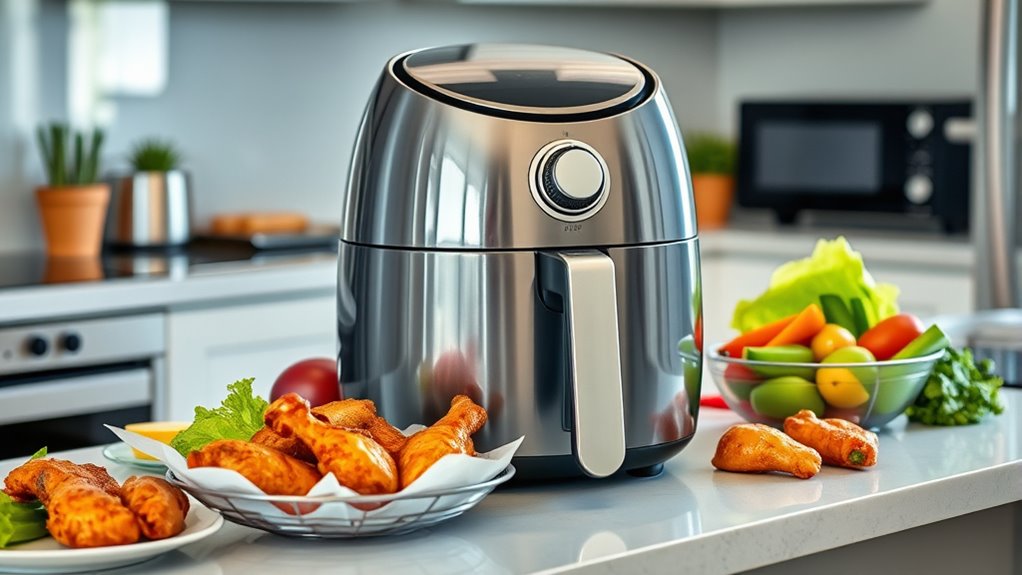 When choosing an air fryer, consider its capacity to match your typical meal size, ensuring you can cook enough for your household. Think about your kitchen space considerations—measure available counter space to find a model that fits comfortably without crowding. Larger capacities are great for families, while smaller ones suit singles or couples. Picking the right size helps you enjoy efficient cooking without sacrificing space or functionality.