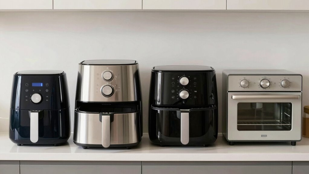 Then there’s the family-sized or multi-purpose air fryer, which often falls into the XL category but can go even larger. It’s designed for big households or meal prepping, with capacities exceeding 5.5 quarts. These models give you the flexibility to cook entire meals in one go, reducing overall cooking time and energy use. They help promote healthy eating by enabling you to prepare fresh, wholesome dishes quickly and efficiently. Since these models are larger, they take up more space, but their ability to cook larger quantities makes them a smart investment if you prioritize energy efficiency and healthy meal prep.