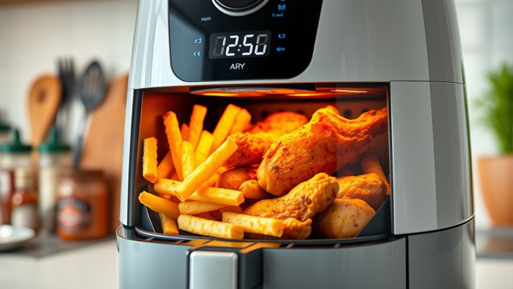Preheating your air fryer isn’t always necessary, but it can improve cooking results by ensuring even heat distribution. Preheating benefits include faster cooking and better crispiness. Plus, it promotes air fryer safety, reducing the risk of undercooked food. If you’re cooking delicate items or recipes requiring precise temps, preheat for a few minutes. For quick snacks, skipping preheat is fine, but always follow your air fryer’s guidelines for best results.
