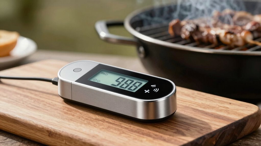Once your meat thermometer has paired via Bluetooth, setting up its Wi-Fi connection is the next step to enable remote monitoring. To do this, open the thermometer’s app and select the Wi-Fi setup option. You’ll need to connect it to your home network by choosing your Wi-Fi name and entering the password. During this process, guarantee your network security by using a strong, unique password to prevent unauthorized access. The thermometer uses signal encryption to protect your data as it transmits between your device and the thermometer, enhancing privacy and security. Additionally, understanding wireless range limits can help you position your thermometer optimally within your home network for consistent connectivity. It’s also beneficial to consider network security best practices, such as enabling firewalls and updating firmware, to further safeguard your connected devices. Follow the app prompts to complete the connection. Once connected, your thermometer will communicate with your smartphone through your Wi-Fi network, allowing you to monitor your meat remotely with confidence in the security of your data.