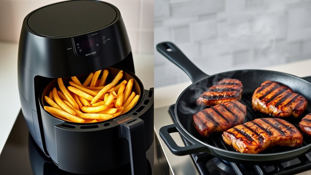 For cooking delicate or thin cuts of meat, the grill pan on your stovetop is the better option. It provides direct heat and better control, allowing you to sear gently without overcooking. The appliance’s suitability for high heat guarantees you get a nice crust while maintaining tenderness. An air fryer might be too harsh or uneven for delicate cuts, risking overcooking or losing moisture, so stick to the grill pan for best results.