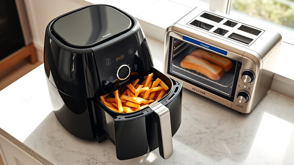 If you mainly cook small batches of snacks like fries or chicken wings quickly, an air fryer is ideal due to its speed and energy efficiency. However, if you want a versatile appliance that can handle larger meals, baking, broiling, and dehydrating, a toaster oven with air frying features can replace several gadgets in your kitchen. For more insights on how to choose the best option for your cooking style, keep exploring the details below.