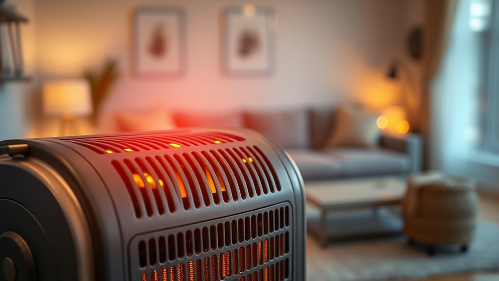 Infrared heating improves indoor air quality by promoting better air circulation, which helps prevent stale, stagnant air. Since infrared heaters don’t blow air directly, they reduce the circulation of dust and allergens, leading to pollutant reduction. You’ll notice cleaner, fresher air because these heaters don’t stir up particles like traditional units. This makes infrared heating a healthier choice, especially for allergy sufferers or those sensitive to airborne pollutants.