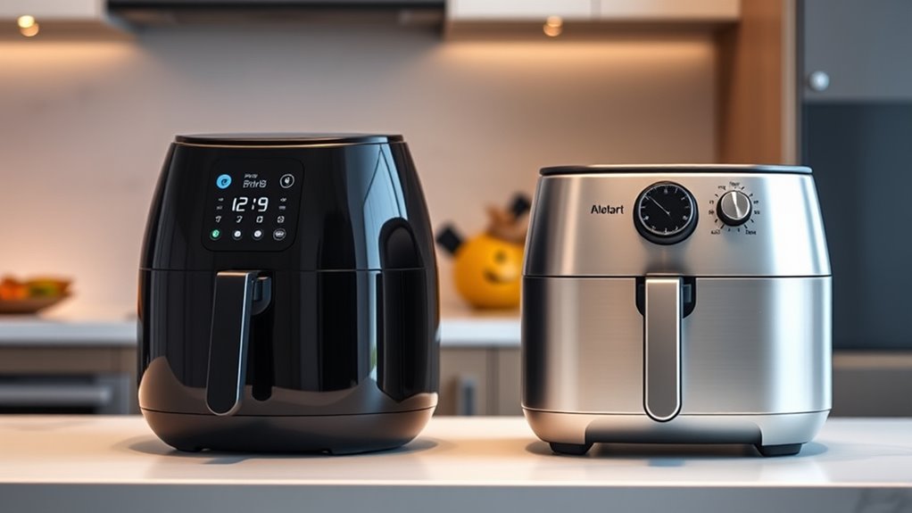 Choosing between app-connected and manual air fryers is like picking your adventure partner—you’ll want one that matches your style. If you love tech and control at your fingertips, the smart fryer is your trusty sidekick. But if simplicity and quickness suit you better, a manual model is like a reliable compass. Either way, you’ll enjoy crispy, delicious meals. So, pick your tool and let your culinary journey take flight—your perfect fried feast awaits!