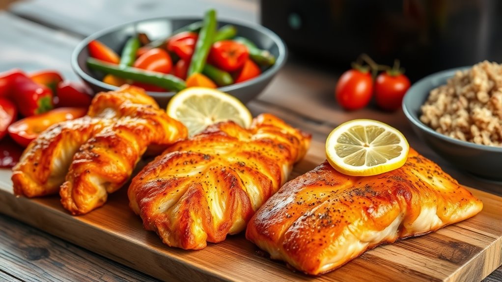 If you’re looking for high-protein air fryer recipes for athletes, you’ll find plenty of flavorful options like crispy chicken strips, salmon bites, turkey meatballs, and tofu nuggets that are quick to prepare and packed with nutrients. These recipes focus on maximizing protein while maintaining great taste and texture, perfect for muscle recovery and energy. Keep exploring for detailed techniques and ingredient ideas to upgrade your meal prep game and fuel your active lifestyle.