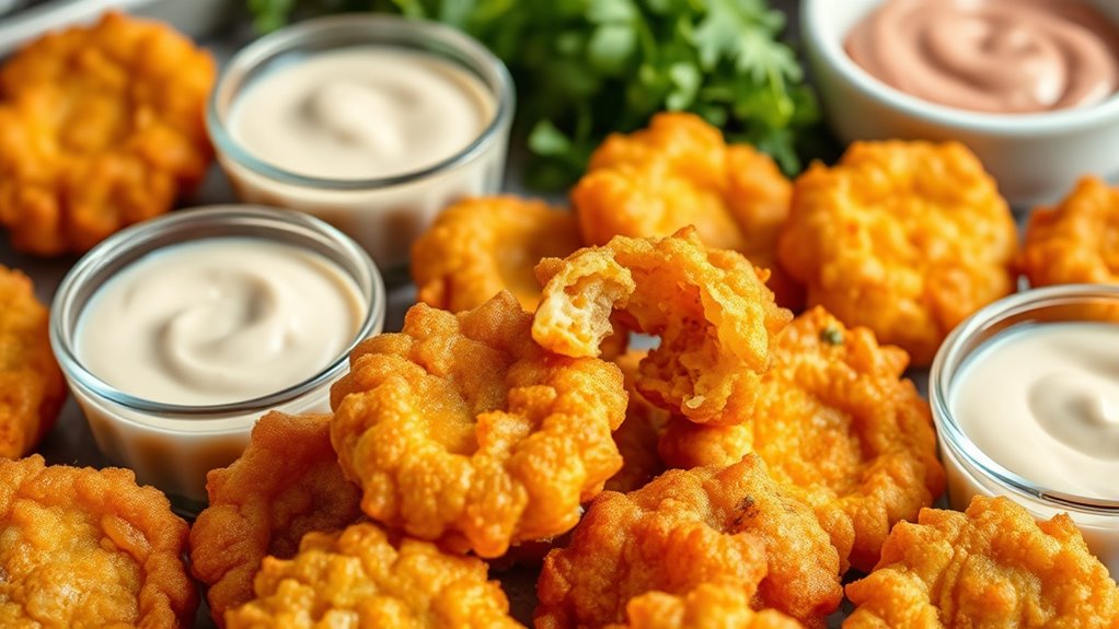 A creamy dill dip perfectly complements crispy fried pickles, enhancing their tangy flavor with a cool, herbal touch. This dip’s smooth, velvety texture balances the crunch, making every bite satisfying. To elevate your snack game, consider these tips: