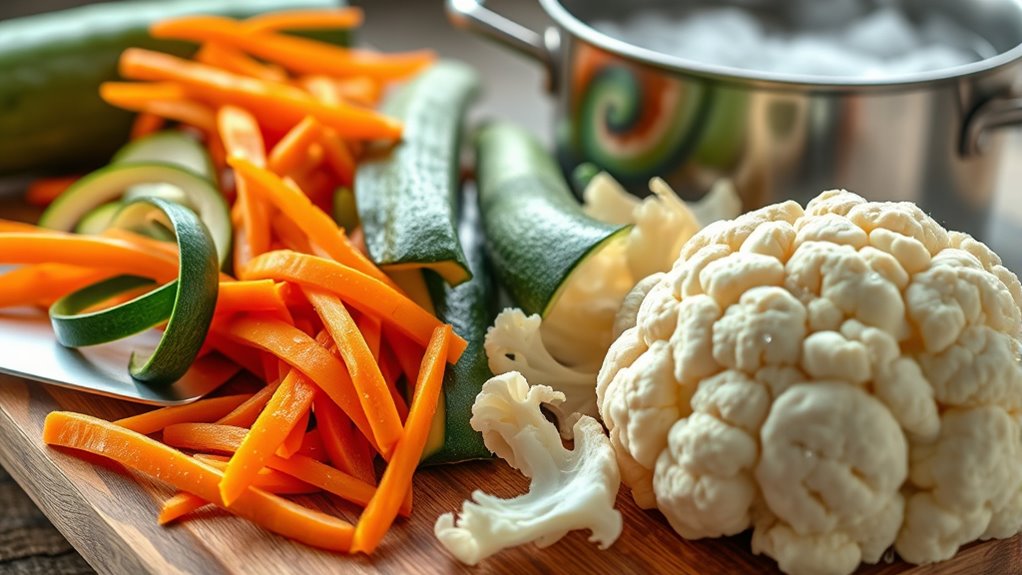 Steaming and boiling are effective methods for reducing oxalate levels in low-oxalate vegetables while preserving their nutrients. To maximize benefits, consider seasonal variations and cultural cuisines that influence vegetable choices and preparation styles. Using proper techniques ensures you retain flavor and nutrients while lowering oxalate content. For example, boiling vegetables for a few extra minutes can substantially decrease oxalates, but be mindful of overcooking, which may diminish nutrients. Incorporating cultural cuisines into your cooking not only inspires creative preparation but also introduces diverse flavors and techniques.