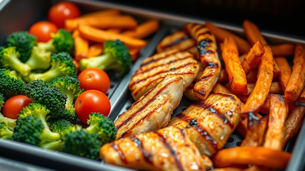 Dual-zone fryers offer a versatile solution for preparing balanced meals efficiently. With their separate compartments, you can create meal plans that include protein, carbs, and vegetables all cooked to perfection. For example, you can prepare crispy chicken in one zone while roasting sweet potatoes in the other. To keep meals interesting, experiment with ingredient substitutions—like swapping cauliflower for potatoes—or add flavor enhancements such as herbs and spices. Here’s a sample meal plan:
