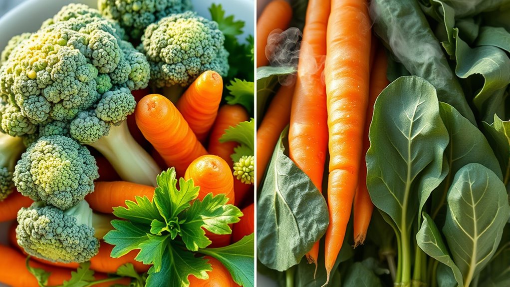 Nutrient losses do vary between different vegetable types, mainly due to vegetable-specific nutrient retention and varietal nutrient differences. You’ll find that some vegetables, like leafy greens, lose water-soluble vitamins quickly during cooking, while others, like carrots, retain more nutrients. Understanding these differences helps you choose the best preparation method to maximize nutrient retention and enjoy the full health benefits of each vegetable.