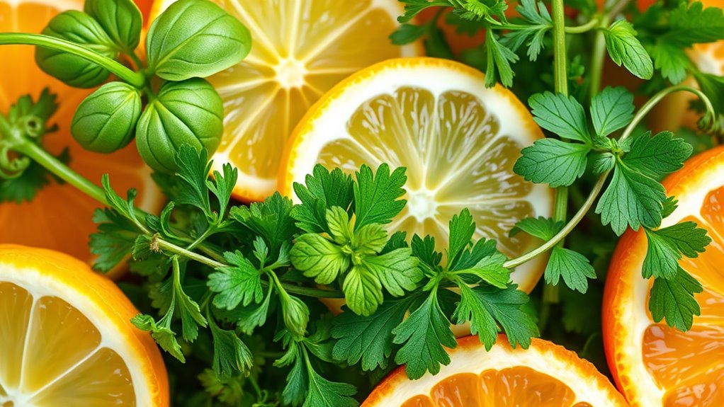 Herbs enhance flavor without salt by adding vibrant herb flavor profiles that elevate your dishes naturally. You can use spice blending techniques to combine herbs like basil, thyme, and cilantro, creating complex layers of taste without sodium. Fresh herbs provide aromatic notes, while dried herbs intensify flavors. Experiment with different combinations to suit your dish, making every bite more flavorful and satisfying without relying on salt.