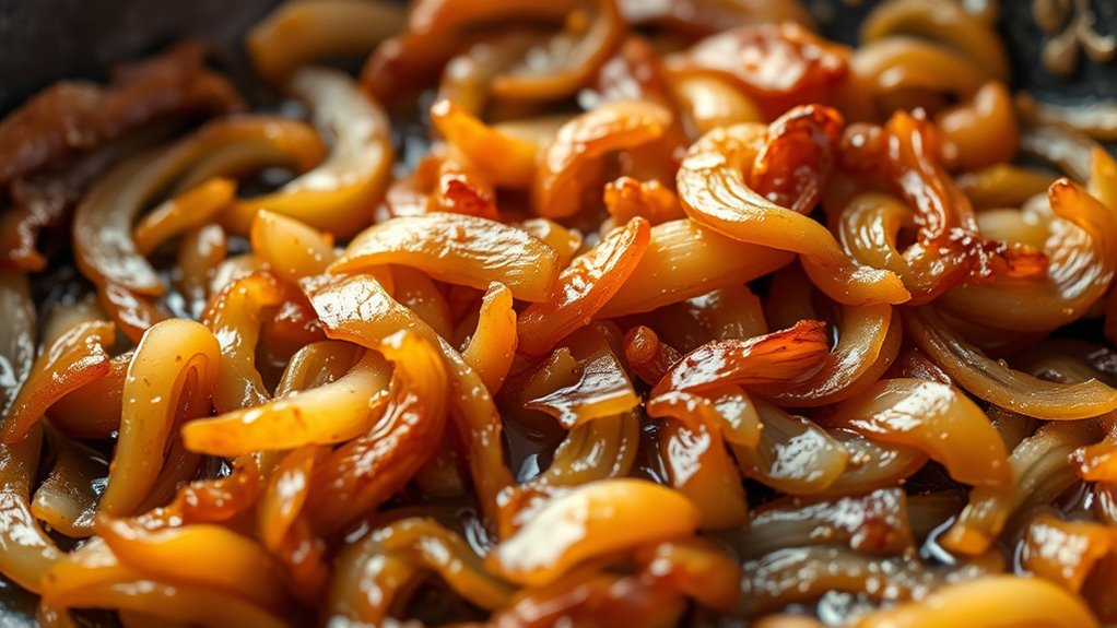 Keep in mind, proper onion storage beforehand guarantees freshness, which impacts caramelization quality. As the sugars caramelize, you’ll understand how patience enhances flavor depth without stirring. This slow process allows the natural sweetness to shine, making your onions irresistibly savory and perfect for any dish.