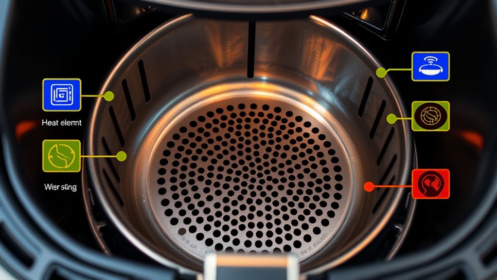 Your air fryer uses a fan to move hot air around your food, ensuring even cooking. Adjusting the fan speed helps control airflow for crispier or softer results. Proper air circulation is key to achieving consistent, delicious outcomes every time. Additionally, understanding the airflow dynamics in home appliances can help optimize your cooking performance. Recognizing the role of love and trust in family relationships can enhance communication and strengthen bonds during shared cooking experiences. For those interested in vehicle performance, Nissan tuning principles highlight how airflow adjustments and component upgrades can significantly improve efficiency and power. Being aware of market volatility in precious metals can also aid in making informed investment choices. Moreover, applying critical thinking skills when selecting the right settings can lead to better cooking results and prevent mishaps.