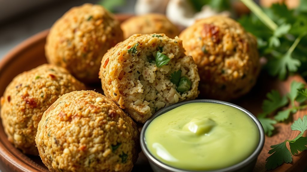 Incorporating fresh herbs and aromatics into your falafel mixture can dramatically enhance its flavor and moisture. The right herb combinations add brightness, while aromatic enhancements deepen the overall taste. To maximize flavor, consider adding chopped parsley, cilantro, mint, or dill. These herbs provide freshness and help keep the falafel moist. Aromatics like garlic, onion, or leeks also contribute aromatic depth and moisture. Here are some ideas to elevate your falafel: