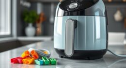 To achieve perfectly crispy granola clusters, focus on the baking process. Start by setting the right baking temperature—usually around 300°F (150°C)—to guarantee even crisping without burning. Spread your mixture in an even layer on the baking sheet, which promotes proper cluster formation. Avoid overcrowding, as this can cause clusters to break apart or become soggy. Stir the granola halfway through baking to promote uniform crispiness. Keep a close eye on it near the end, as lower sugar content can make it prone to burning quickly. Once baked, let the clusters cool completely; they’ll firm up as they cool, ensuring they stay intact. Proper temperature control and careful baking are key to achieving those crunchy, well-formed clusters you want. Additionally, using appropriate baking tools can help ensure consistent results.