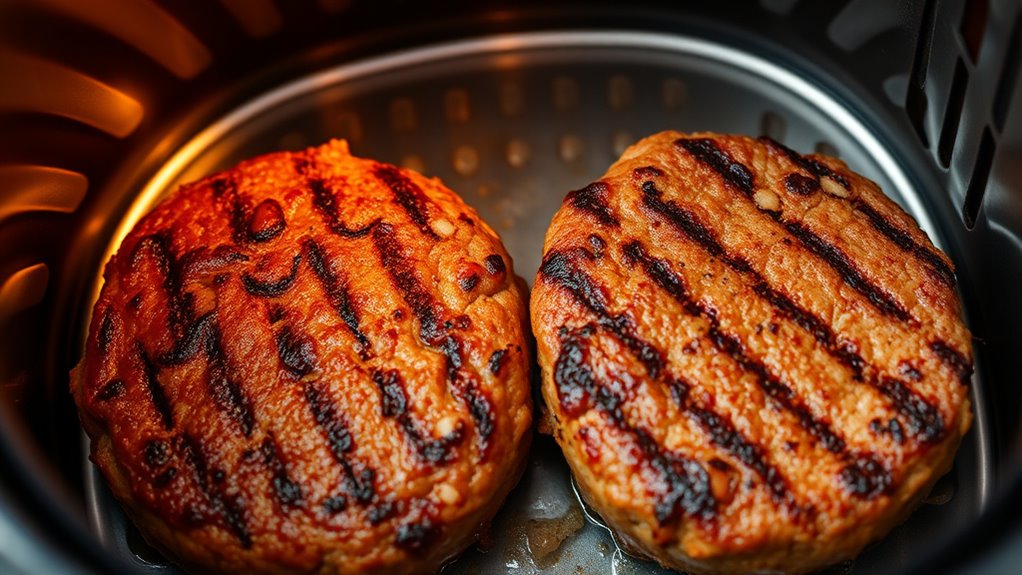 You should flip the burgers during cooking to guarantee even browning and thorough cooking. Use proper flipping techniques, like gently turning them with tongs halfway through the cooking process. For browning tips, avoid overcrowding the basket and pat the patties dry before cooking to promote a nice crust. Flipping helps achieve a consistent, juicy burger with a beautifully browned exterior on both sides.