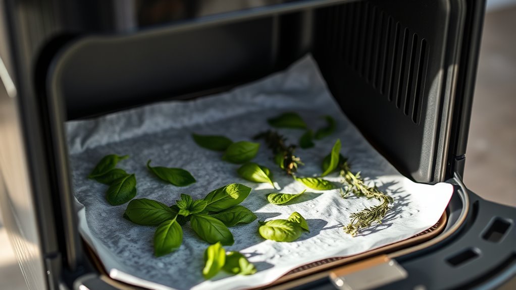 To gently dry herbs in an air fryer, first harvest them early in the day when oil content is highest. Gently wash and thoroughly dry the herbs, removing thick stems and using smaller leaves. Arrange them in a single layer without overcrowding, set the air fryer between 100°F and 120°F, and keep the door slightly open for moisture to escape. Check and turn herbs halfway through. For more tips on preserving delicate herbs, keep exploring the process.