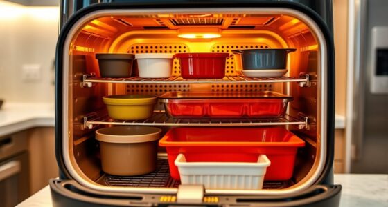 To expand your air fryer’s capabilities, you should consider accessories like silicone mats to prevent sticking, metal racks for stacking multiple layers, and baking pans for desserts or casseroles. A skewers set allows for grilling kebabs, while a pizza pan helps make crispy pizzas. These accessories make cooking more versatile, letting you prepare a wider variety of meals with ease and creativity.