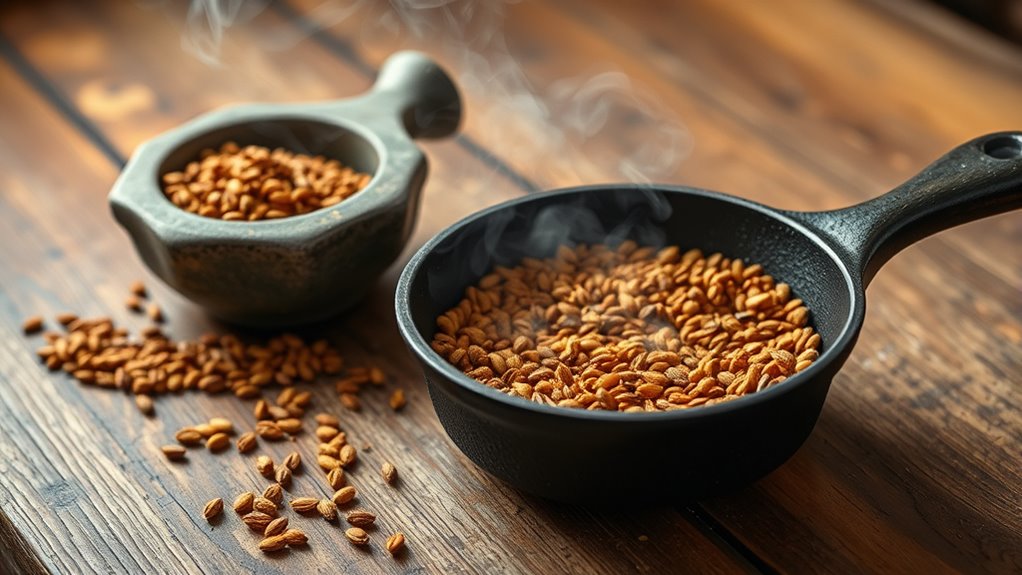 To deepen your spice flavors, start by choosing fresh, high-quality spices like cumin or coriander, and guarantee they’re completely dry. Use a dry skillet over medium heat, shaking constantly to toast evenly and prevent burning. You’ll know they’re done when they emit a rich aroma and develop a light golden color. Cool them quickly and store in airtight containers. Want to open up even more flavor? Keep exploring the best techniques and tips to master toasting.