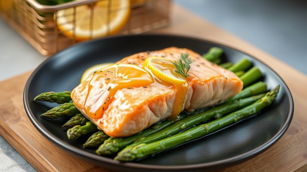 Achieving perfectly juicy keto salmon fillets in the air fryer depends on a few simple techniques. First, use skin-on salmon fillets to lock in moisture and enhance flavor during cooking. Second, brush the fillets with olive oil or melted butter before seasoning with herbs and lemon—this boosts juiciness and prevents drying out. Third, cook at 375°F (190°C) for 8-10 minutes, flipping halfway to ensure even cooking. To avoid overcooking, check for an internal temperature of 145°F (63°C) or when the flesh flakes easily. After cooking, let the fillets rest for a few minutes to allow the juices to redistribute, resulting in tender, juicy salmon. Incorporating proper storage techniques can also help maintain the freshness and quality of your salmon before cooking. Additionally, understanding the nutritional benefits of ingredients like lemon and herbs can enhance both flavor and healthfulness. Using AI-powered processing in food technology is also advancing how we perfect recipes and cooking methods. These tips help you achieve perfectly cooked, flavorful, and juicy salmon fillets every time. Furthermore, paying attention to color accuracy during storage can ensure the visual appeal and freshness of your ingredients. Being aware of automation in food tech can also lead to more consistent results in preparing your meals.