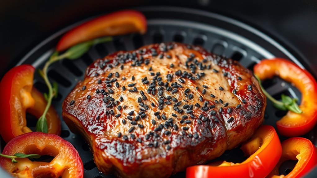 Achieving juicy, crispy skin on your garlic herb whole chicken in the air fryer starts with guaranteeing the chicken is thoroughly thawed, which promotes even heat distribution. Once thawed, apply a generous layer of garlic herb butter or marinade under and over the skin to lock in moisture and boost crispiness. Preheat your air fryer to 375°F (190°C) and cook the chicken for about 50-60 minutes. To ensure perfect doneness, use a meat thermometer to reach an internal temperature of 165°F (74°C). During cooking, flip or rotate the chicken halfway to promote even browning and prevent uneven skin. By following these steps, you’ll enjoy a beautifully crispy skin and juicy interior every time, making your air fryer chicken a keto-friendly winner.