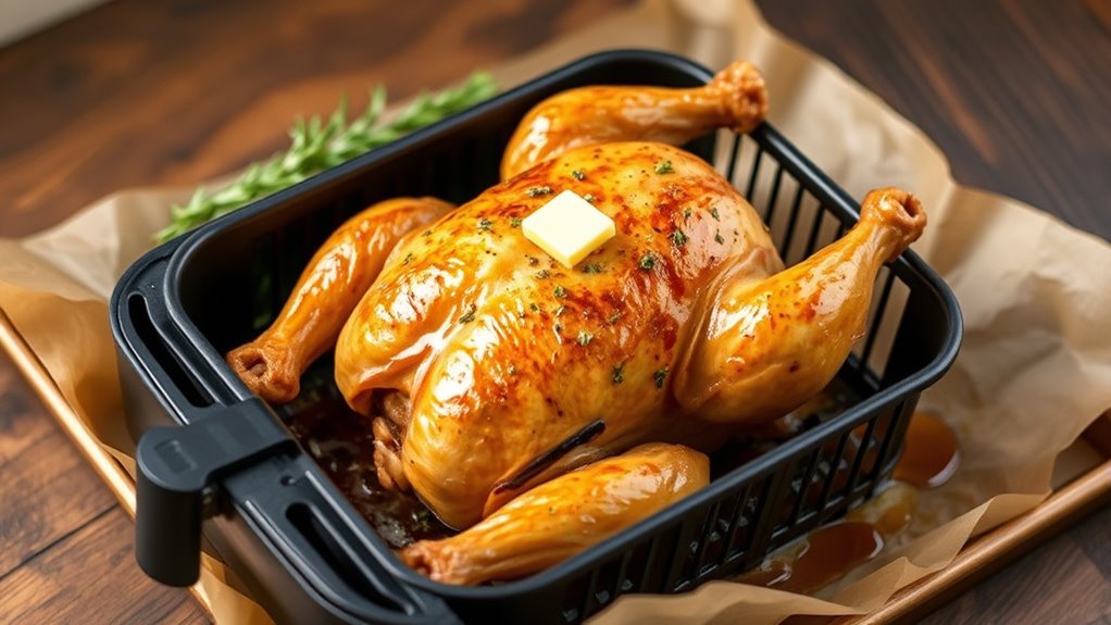 To make a flavorful garlic herb whole chicken in the air fryer, start by preparing a mixture of garlic, herbs, salt, and pepper to season the bird evenly. Confirm the chicken is fully thawed and dry so it cooks evenly and develops crispy skin. Using an air fryer rack or trivet helps circulate heat properly, resulting in juicy, crispy skin.
