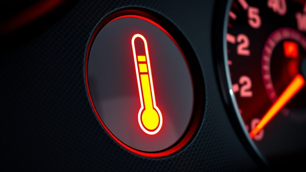 When your overheating warning light comes on, it means your engine is running too hot and needs quick attention. This light is connected to sensors that monitor engine temperature, and it signals potential issues like coolant leaks, a broken water pump, or a clogged radiator. Ignoring it can cause serious damage, so it’s best to pull over safely and check your coolant levels or seek help. If you want to understand more, you’ll find helpful details ahead.
