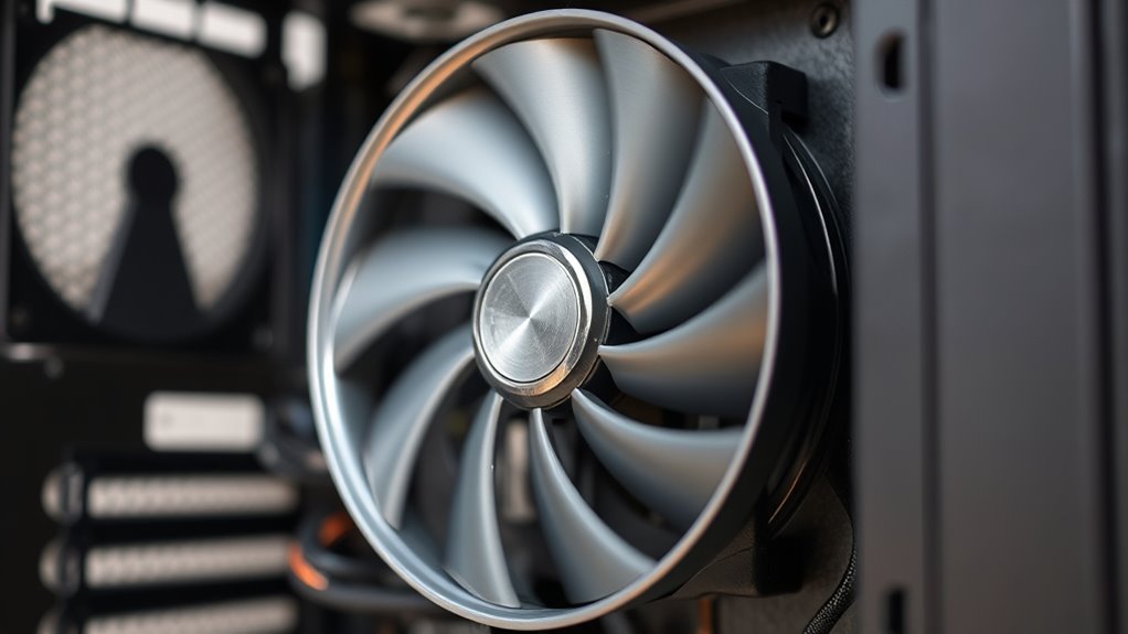 Loud fans aren’t always signs of failure; sometimes they just reflect their age or dust buildup affecting their lifespan. You can often improve noise levels with software fixes, like updating firmware or adjusting fan settings. If your fan’s lifespan is nearing its end, noise may increase even if it still works. Regular maintenance and software tweaks can extend its life, but listen for persistent rattles or reduced cooling, which might mean replacement is needed.