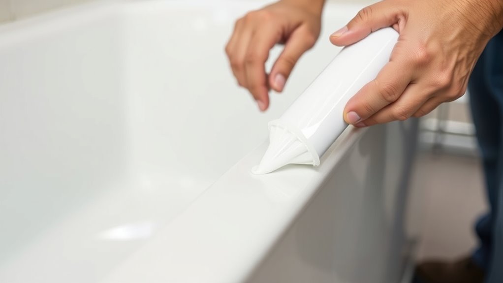 Are you ready to apply the new silicone sealant for a reliable, long-lasting seal? First, verify the silicone sealant you choose is compatible with the surface material to prevent adhesion issues. Clean the area thoroughly, removing any dust, grease, or old sealant residue. Proper surface preparation is essential for humidity control, which helps the sealant cure evenly and effectively. When applying, use a steady hand to create a smooth, continuous bead along the joint or crack. Avoid gaps or lumps, as these can lead to leaks later. Take your time to apply the sealant evenly, ensuring complete coverage. Once finished, smooth the sealant with a finger or tool to enhance adhesion and appearance. Proper application guarantees a secure, durable seal that resists moisture and humidity. Adequate curing conditions are crucial to ensure the longevity of the sealant and prevent future leaks.