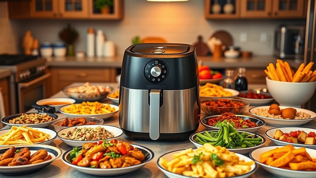 Balancing course preparation involves carefully planning your menu and scheduling cooking times to maximize efficiency. Start by selecting dishes that complement each other and can be cooked simultaneously in your air fryer. Consider plate presentation to ensure each course looks appealing and cohesive. Efficient ingredient sourcing is key—choose ingredients that can be used across multiple dishes to avoid unnecessary trips or leftovers. Map out your cooking schedule to ensure each course is ready at the right time without overlapping or causing delays. Keep in mind the size and capacity of your air fryer to prevent crowding. Additionally, understanding plug availability is essential for a seamless cooking process, especially when coordinating multiple dishes. By organizing your menu and timing thoughtfully, you’ll streamline preparation, maintain quality, and impress your guests with a well-coordinated meal.