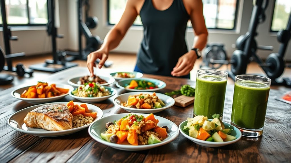 After your workout, focus on consuming high-quality protein within 30-60 minutes to support muscle repair. Combine this with quick-digesting carbs like fruits or grains to replenish glycogen stores. Stay hydrated with water and electrolytes, and include healthy fats to reduce inflammation. Timing your meal right accelerates recovery and energy restoration. Stick to whole foods and balanced macronutrients, and you’ll optimize your results. Keep going, and you’ll learn exactly how to craft the perfect recovery plan.