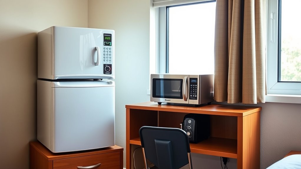 Many dorms permit a range of essential appliances that help you stay comfortable and productive. These common appliances include items that are generally safe and easy to maintain, provided you follow microwave safety guidelines and appliance maintenance tips. Such devices often include:
