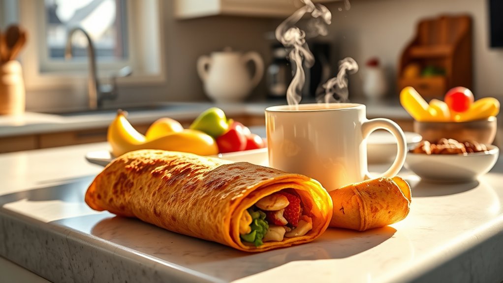If you’re looking to sustain your energy levels between meals, incorporating wholesome mid-morning snacks can make a significant difference. Opt for nutrient-packed options like fresh fruit, nuts, or yogurt to keep you fueled. Smoothie pairings are an excellent choice; combine berries, spinach, or banana with your favorite beverage options for a quick, satisfying boost. These snacks are easy to prepare and portable, making them perfect for busy mornings. To help you choose, here’s a quick guide: