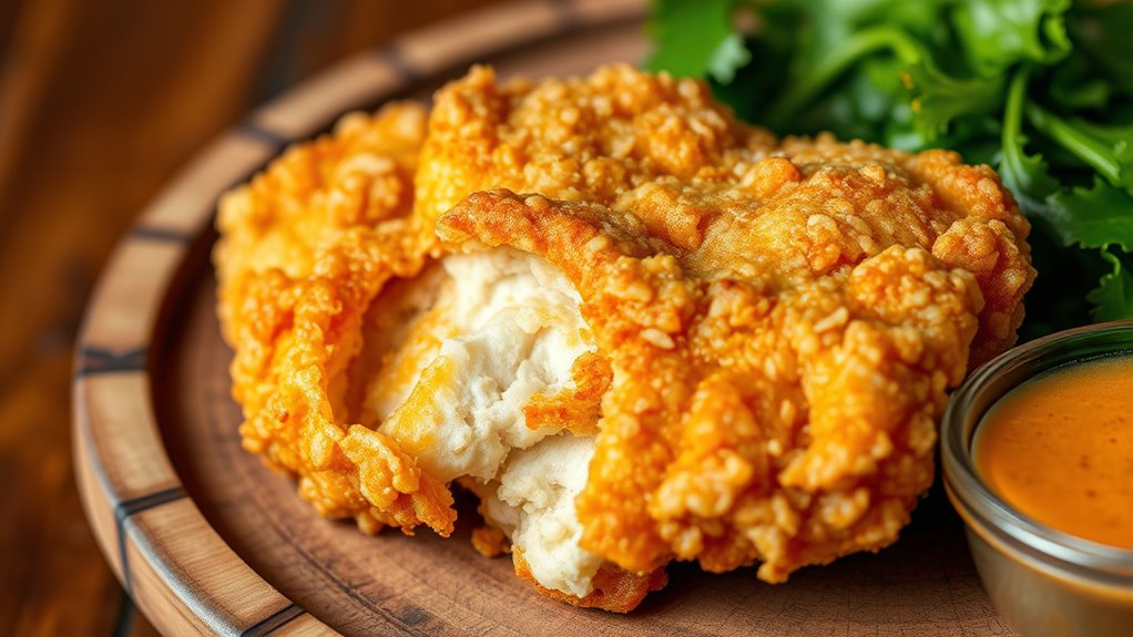 Did you know that gluten-free diets are now followed by over 30 million Americans? For a healthier twist, you can easily swap traditional breading with gluten-free breadcrumbs or an almond flour coating. These options give your fried chicken a crispy texture without gluten, making it suitable for gluten sensitivities. Using gluten-free breadcrumbs or almond flour coating keeps the dish delicious and inclusive, so everyone can enjoy your homemade fried chicken.