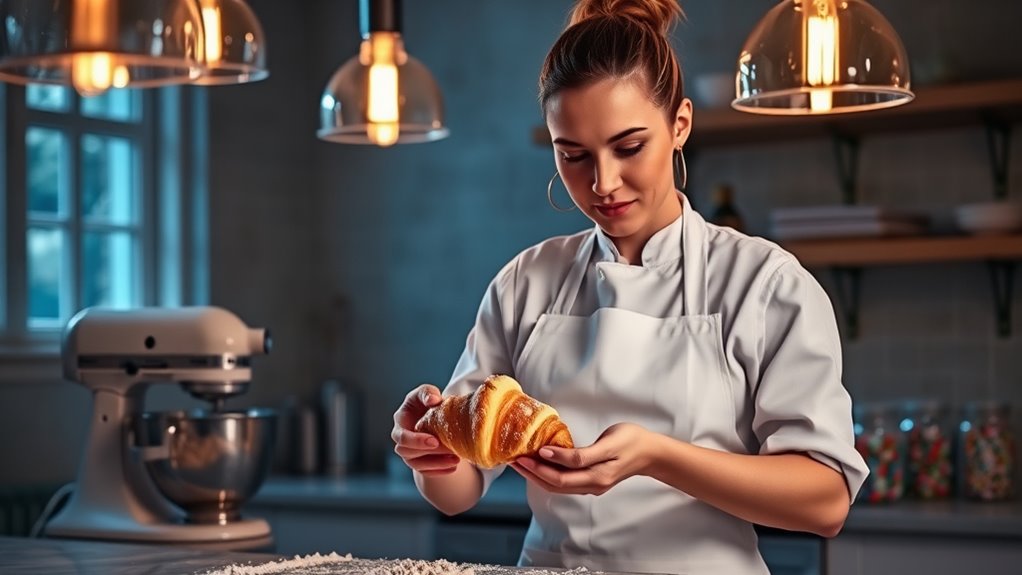 You face challenges like maintaining ingredient stability and flavor consistency during nighttime pastry creation. Without proper lighting, it’s harder to see details clearly, risking mistakes. You must manage fatigue, which can impair your focus and precision. Balancing these factors requires careful planning and attention to detail. Despite these hurdles, your dedication helps you produce quality pastries, even under the quiet, late-night hours when distractions are minimal.