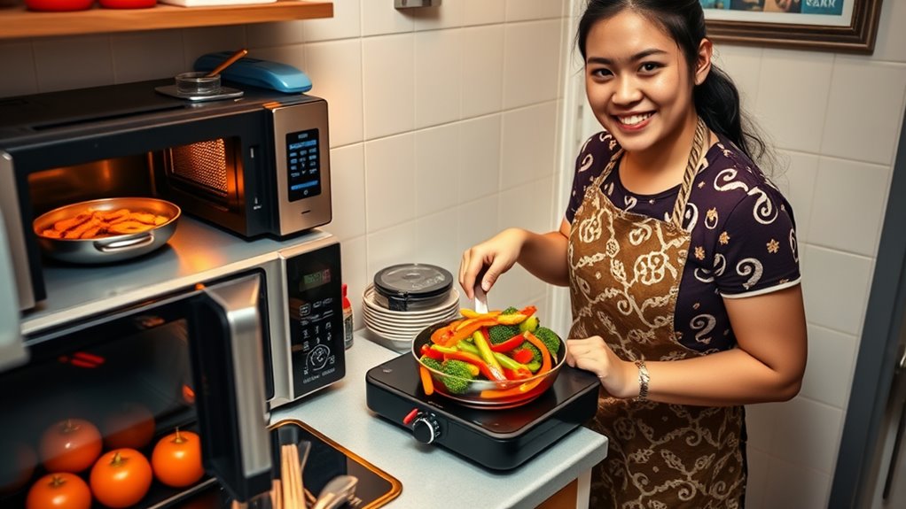 As an international student cooking without an oven, you can rely on essential gadgets like electric skillets, slow cookers, and microwaves to whip up tasty meals. Stick to quick stove-top recipes like one-pot pasta or stir-fried rice, and get creative with microwave desserts and snacks. Efficient meal prep and clever storage help maximize your limited space. Keep exploring more ideas so you can make the most of your small kitchen and stay satisfied.