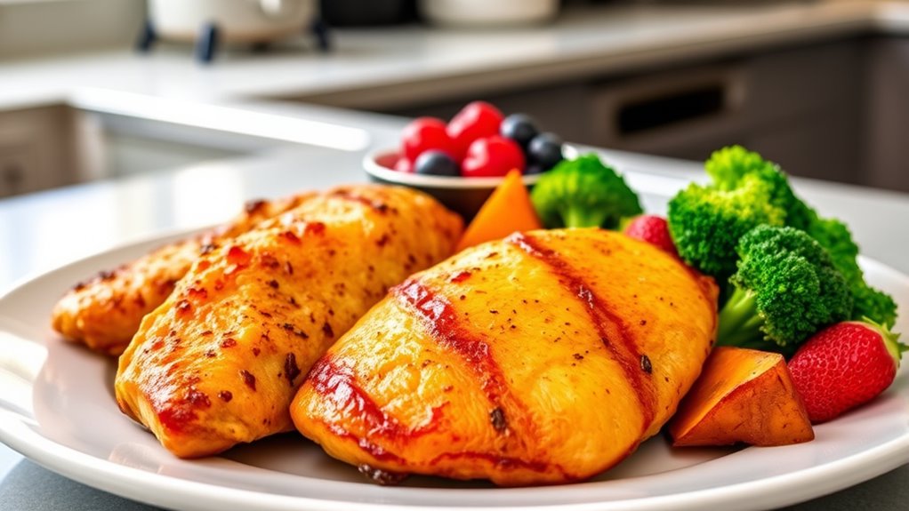 To drop 25 pounds using air fryer meals, focus on healthy meal planning, portion control, and nutrient-rich ingredients. Choose an air fryer with safe features, like cool-touch handles, and use oil alternatives to reduce fats. Incorporate plenty of vegetables, lean proteins, and whole grains into your meals. Preparing meals in advance and tracking your progress can help stay motivated. Keep these tips in mind, and you’ll discover more ways to succeed on your weight-loss journey.