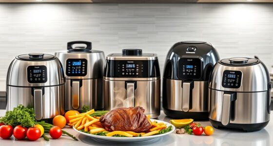 I’ve tested many air fryer breadcrumb mixes and found that options like Aleia’s Italian bread crumbs, Louisiana Fish Fry coatings, and Zatarain’s seasoned mixes give me crispy, flavorful results every time. They’re versatile for chicken, fish, vegetables, and more, with some offering gluten-free or seasoned options. Proper coating and cooking time are key, but choosing the right mix really makes a difference. If you want to discover the top picks and application tips, keep exploring further.