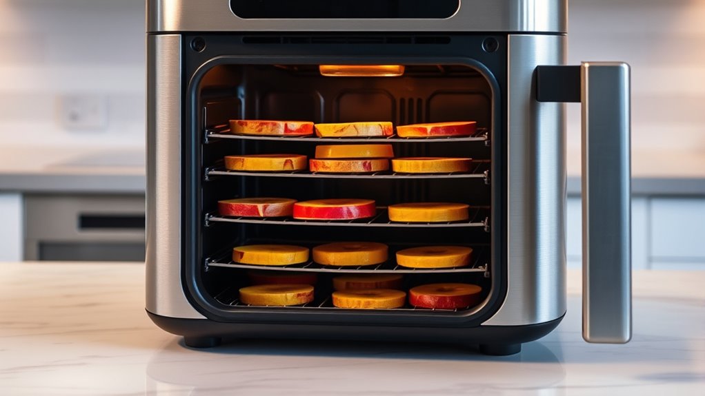 Preset dehydration modes take the guesswork out of drying fruit by automatically adjusting temperature and time settings based on the type of produce. I find these programs incredibly helpful because they ensure consistent results without constant monitoring or manual adjustments. Many air fryers offer specific modes for common dehydrating tasks like drying apples, berries, or mangoes, making the process straightforward. Using preset modes also helps prevent over-drying or under-drying, as they tailor the settings for ideal texture and moisture removal. Some models even include step-by-step instructions or visual cues to guide me through each stage. Overall, these modes make dehydrating fruit more convenient, reliable, and user-friendly, especially for those new to the process or aiming for perfect snacks every time.