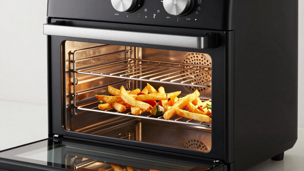 Having multiple cooking functions in an air fryer oven with racks considerably boosts its versatility, allowing me to prepare a wide range of dishes with just one appliance. I can air fry, bake, broil, roast, dehydrate, and toast, which means fewer devices clutter my kitchen. Switching between modes is straightforward, and some models even have preset programs for consistent results. This flexibility lets me customize cooking methods to enhance texture and flavor, catering to different dietary needs with healthier, oil-free options. The ability to cook multiple foods simultaneously at different temperatures saves time and broadens meal options. Overall, the variety of functions makes my cooking more efficient, diverse, and fun, transforming my kitchen experience with just one versatile appliance.