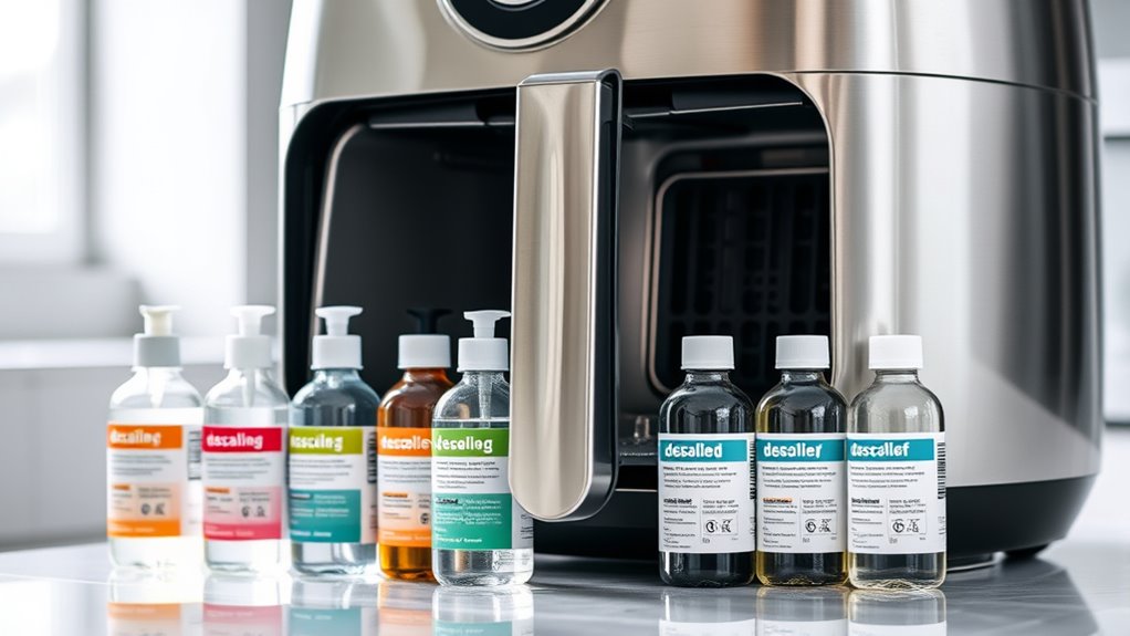 Are you confident that your air fryer’s descaling solution is safe and suitable for regular use? It’s crucial to choose a formula made with food-safe, non-toxic ingredients to avoid health risks. Acid-based cleaners like phosphoric or sulfamic acid are effective at dissolving mineral buildup but must be used carefully to prevent damage. Make sure the descaler doesn’t contain harsh or corrosive chemicals that could harm internal components such as heating elements or surfaces. Opt for solutions with biodegradable, odorless formulas to reduce fumes and ensure indoor safety. Always verify that the chemical composition complies with household appliance safety standards. Prioritizing safety and proper chemical makeup helps protect your appliance and your health during every descaling session.