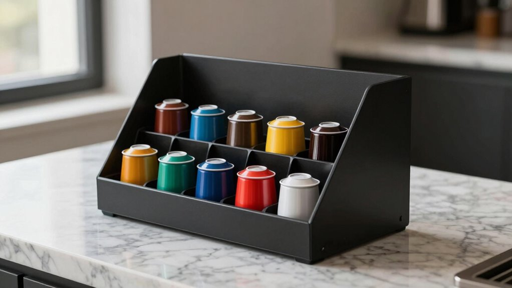 Choosing the right coffee pod holder is like finding the perfect key to your morning ritual—it opens both style and convenience. Whether you prefer a sleek drawer, a sturdy stand, or a rolling organizer, there’s something for everyone. Remember, a well-chosen holder transforms chaos into order, much like a maestro conducts an orchestra. So, select wisely and let your coffee station become a symphony of functionality and flair.